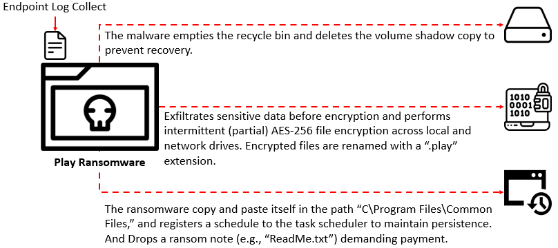 Play (PlayCrypt) ransomware is distributed mainly as Windows executables (with Linux/ESXi variants observed) and, when executed, performs intermittent (partial-chunk) encryption of important files; encrypted files are typically saved with a .play extension or similar; the Advanced Encrpytion Standard(AES) file-encryption keys are protected using Rivest-Shamir-Adleman(RSA) encrpytion algorithm and held by the attacker (i.e., decryption requires the attacker’s private key).