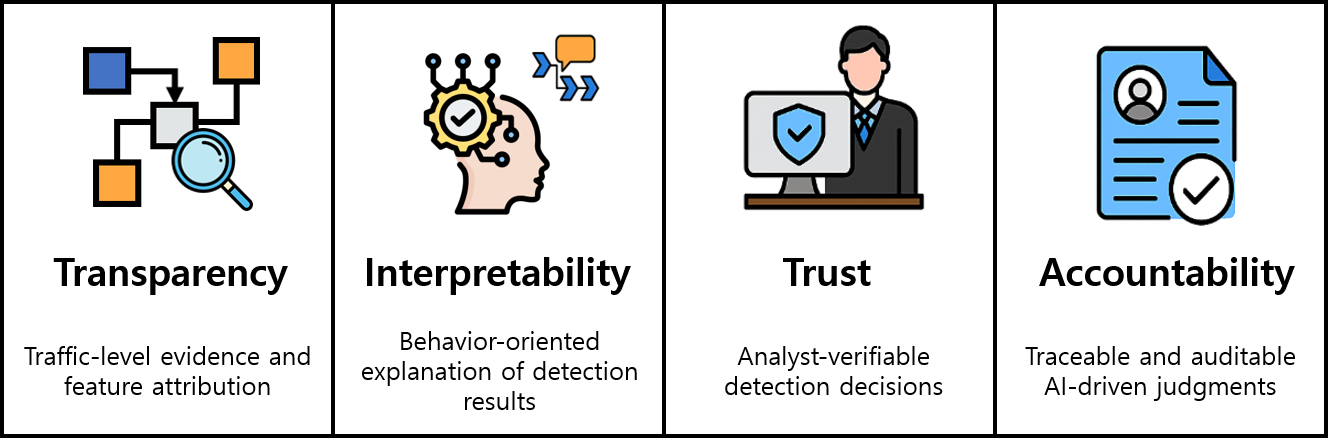 Figure Key goals of XAI in malicious network detection: transparency, interpretability, trust, and accountability.
