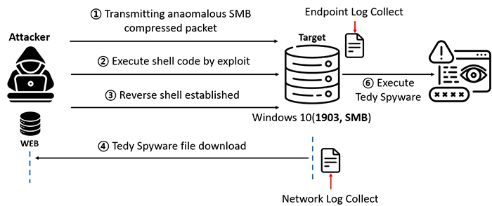 The attacker performs a reverse shell connection via the Windows 10 SMB vulnerability using a T2-24-01-S-N-CL attack. Using curl commands the attacker downloads and exectes Tedy Spyware in T6-24-02-S-E-DEGN. To evade Window Defender detection, the spyware uses PowerShell scripts to perform system setup and information gathering, excluding itself.